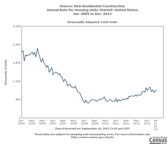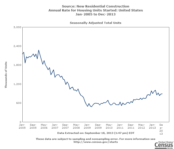 Housing starts increased 0.9% for August to a seasonally adjusted annual rate of 891,000, according to a Commerce Department report (link opens a PDF) released today.