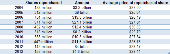 Shares currently trade at around $33, so the average return on investment for Microsoft's repurchase has been fairly low. But, hey, it beats cash in the bank.