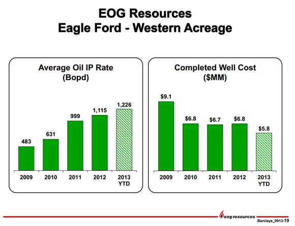 EOG has a prime position in the Eagle Ford shale. It's what has fueled the company's rise to the top oil producer in the play. However, thanks to advances in completion techniques, a reduction in the average number of drilling days as well as the fact that EOG has its own source of proppant sand, it's able to simply print money from the play. The following slide shows that these advances are increasing the average initial production rate of each well, while at the same time well costs are falling, which are the key ingredients to improved returns.