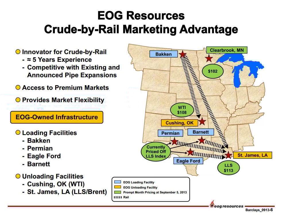EOG isn't the top producer in the Bakken, but it is enjoying 100% returns here as well. New frac technology is helping to improve recovery and returns. In addition to that it's using its innovative crude-by-rail system to get top prices for its oil by shipping it to St. James, Louisiana. The slide below shows that by sending its oil to St. James it's able to get upwards of $11 per barrel more of its oil.