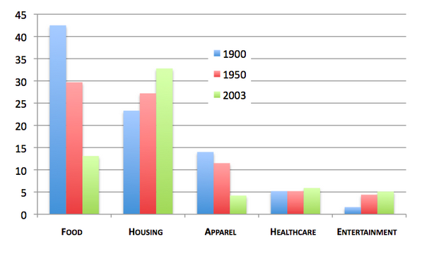 But beyond improved access to food, there are several other economic benefits that come with readily available food. First and foremost, when we aren't spending such a large percentage of our income on food, there are lots of other places that we can spend it.