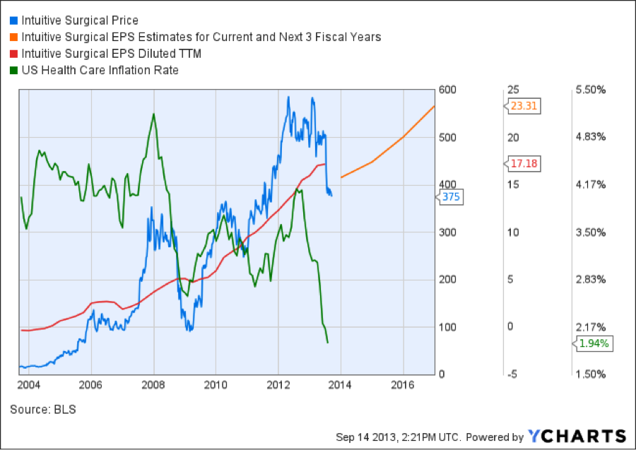 The most substantial headwind for Intuitive Surgical is the slowing rate of heath care inflation, as shown above. Hospitals have been more reluctant to install new systems and insurers have aggressively fought to reduce heath care costs recently. It is important to note that 57% of revenues for the prior fiscal year are recurring and would be expected to continue without installation of new surgical systems. In order to operate the da Vinci system, a hospital must sign an annual service agreement (15.7% of 2012 sales) and purchase instruments and accessories (41.4% of sales). While core system sales have been disappointing -- falling from 175 in the fourth quarter of 2012 to 143 in the second quarter of 2013 -- the effect on profitability has been buffered by recurring revenue.