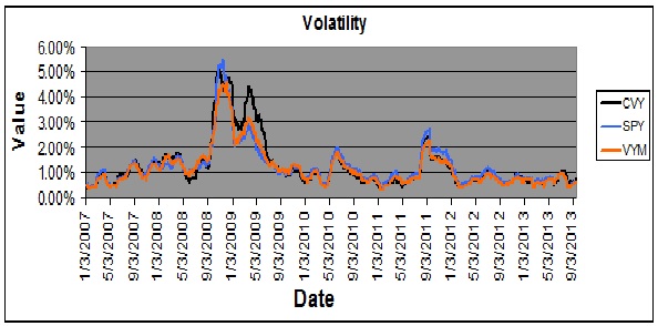 However, most importantly we see that the volatility line for CVY is almost in synchronization with that of the other two ETFs, indicating that CVY does in fact generate those extra yields without the extra volatility.