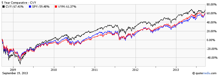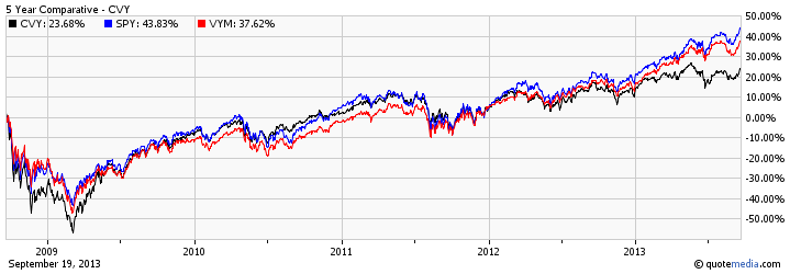 Consider the following two charts, which compare the performance of CVY with two other ETFs over five years. Representing the sentiments of the broader markets is the ultra-popular SPDR S&P 500 ETF (SPY +0.00%) whereas the Vanguard High Dividend Yield ETF (VYM +0.03%) represents another very different income ETF compared to CVY, as it primarily tracks the performance of dividend paying equities..