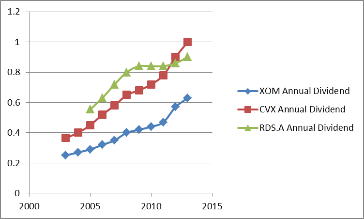 The history tells us a different story. Over the past 20 years, ExxonMobil has averaged a nearly 7% annual dividend hike. Chevron has boosted its dividend by an impressive 10% per year on average, and Royal Dutch Shell comes in last with a 6.3% average annual raise. Impressively enough, Chevron has also gained the most in terms of share value over the same time period. Take a look at each company's dividend over the past decade. Bear in mind that in terms of determining who is the best "dividend raiser," steeper is better.