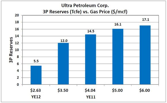 The reason that so many companies' reserves fell off a cliff is because proved reserves that are reported on an SEC document are actually a complicated calculation based on the total oil or gas in place, current operating costs, and the price oil and gas has sold at for the past 12 months. So in 2012, these companies had to report its reserves based on a gas price of around $2.63. As we continue to see natural gas prices pick up and exploration and production companies get better at shale drilling, these proved reserve numbers will pick back up. In fact, Ultra estimates that if prices remain in the $3.50 range, its 3P reserves--proved, probable, and possible-- will more than double what they were at the end of 2012.
