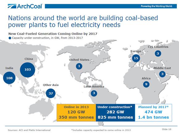 Take special note of both China and India. Each nation is building well in excess of 100 GW of new coal-fueled generating capacity. The problem for these countries is neither produces enough coal to support current demand, let alone that future demand. That's opening up a huge opportunity for U.S.-based coal producers like Arch Coal (NYSE: ACI) to offset its declines at home by exporting coal into the world's markets.