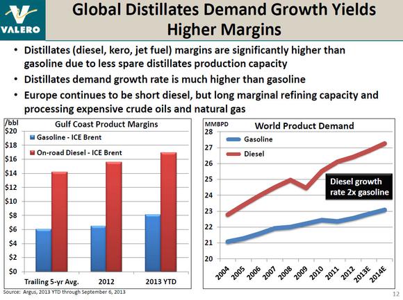 Diesel's growth rate is creating an incentive for U.S.-based refiners such as Valero (VLO +0.61%) and Phillips 66 (PSX +0.14%) to increase production of the fuel. That incentive is amplified by the fact that it's much more profitable to produce diesel, as the chart on the left of the preceding slide indicates. It's probably not surprising that Valero and Phillips 66 are both investing to increase access to world export markets. What this means is that diesel's price will continue to be driven by global demand.