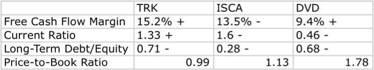 As demonstrated by the table above, which has five-year averages for each metric being evaluated, and illustrates via a + or – the general five-year trend, Speedway Motorsports has more attractive free cash flow margins and is priced at a discount to International Speedway and Dover from a price-to-book standpoint. This indicates the company may be undervalued relative to its peers.