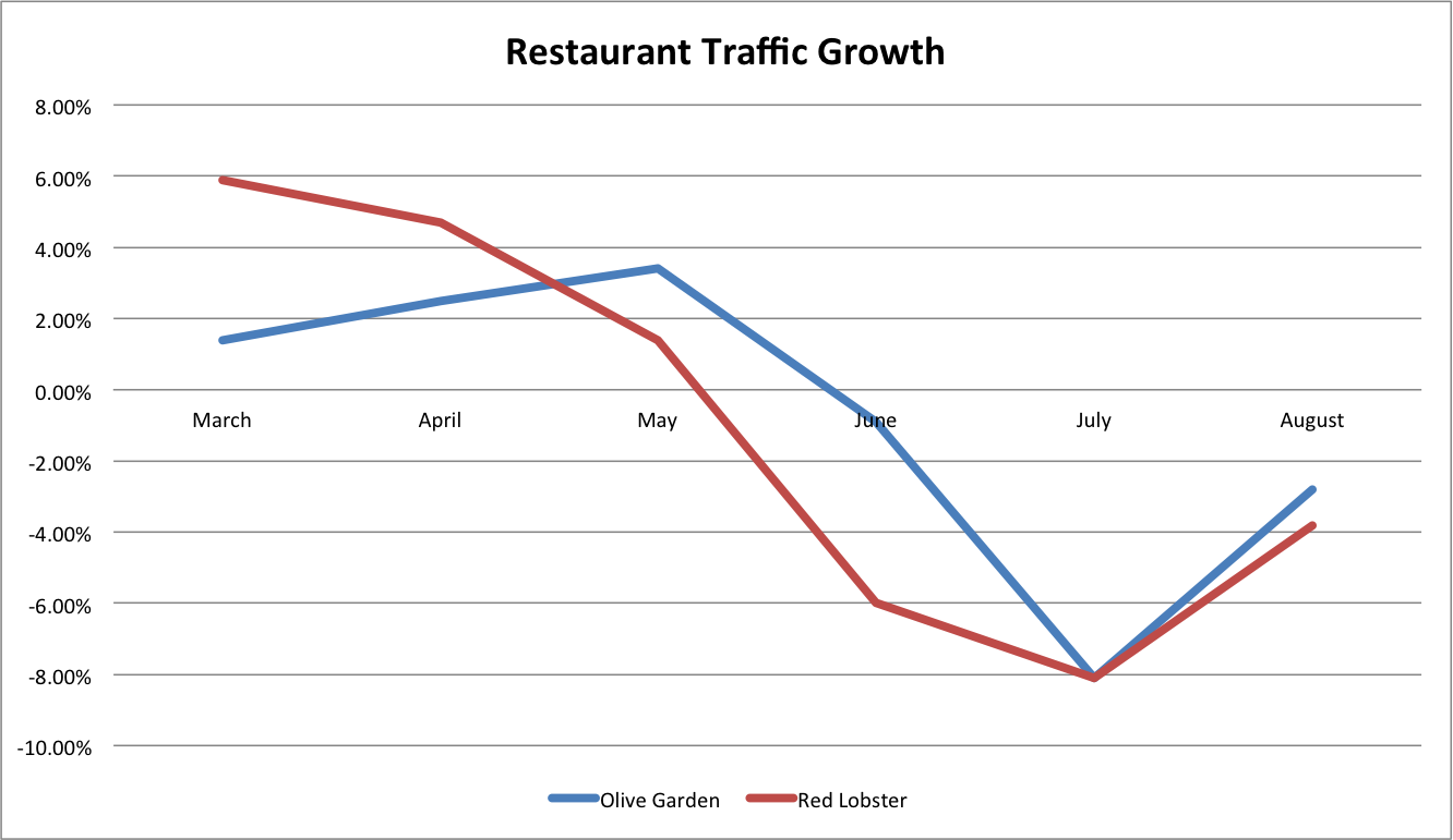 Earnings fell by 38% at Darden overall, as Olive Garden booked a 4% dip in sales and Red Lobster saw a 5% drop. July was particularly slow: 8% fewer customers packed into booths at either of the national chains.