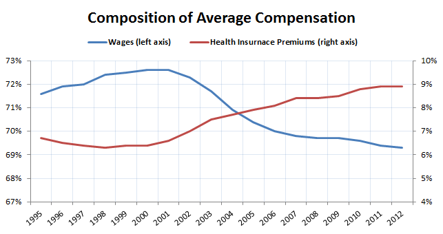 Since peaking in 2000, wages as a percentage of compensation have declined by 3 percentage points, and employer-paid health insurance premiums increased 2.5 percentage points. The average employees actually received a raise over the last decade. It just came in the form of higher insurance premiums.