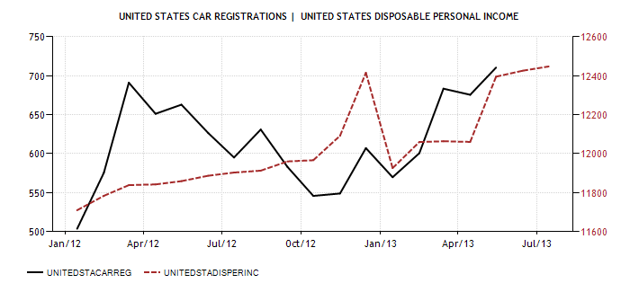 One of the main reasons behind the tepid performance in apparel retail has been the fact that dollars are being spent on other items as consumers hurry to take advantage of still low interest rates. As we see in the graph below, with the rise in disposable personal income, car registrations have gone up.