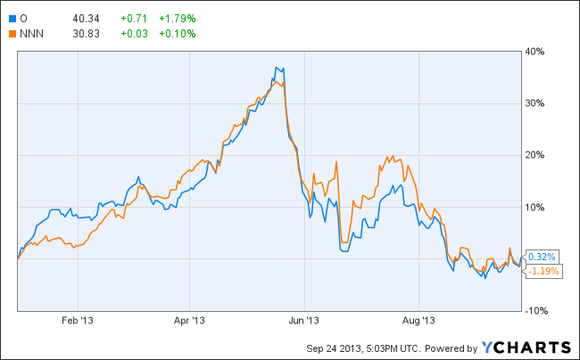 Even as real estate sits empty across the country, two of the biggest retail real estate investment trusts, Realty Income Corp. (O +0.96%) and National Retail Properties (NNN +2.62%), reached new all-time highs in 2013: