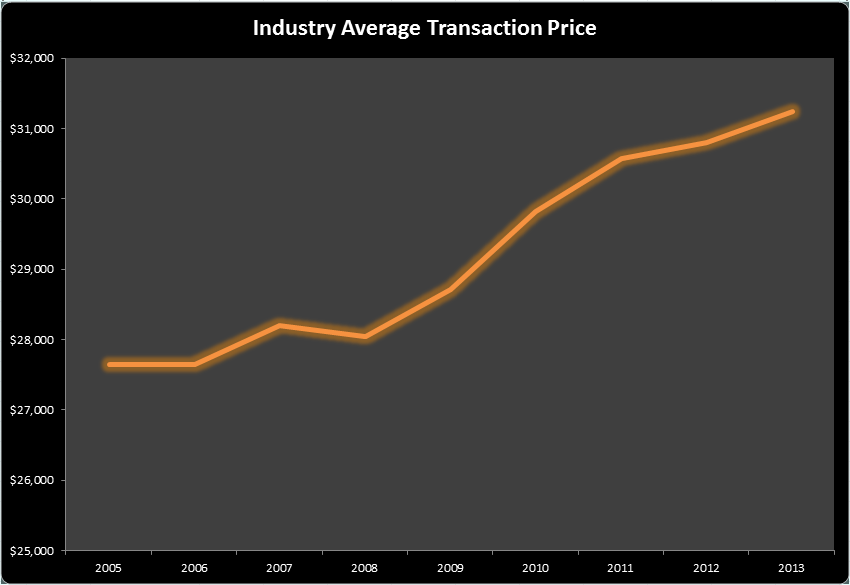 Right now, vehicle infotainment and wireless technology, such as MyFord Touch and Chevy MyLink, are driving transaction prices higher as used vehicles often lack these new systems. One of the biggest reasons for the increase is that Ford and GM weren't profitable before the recession and were forced to close plants and cut production drastically. It's estimated that Detroit automakers can now break even at Seasonally Adjusted Annual Rate sales levels of 10.5 million-11 million, a huge difference from being unprofitable at SAAR levels of 17 million. That difference in production and profitablilty equates to a much smaller supply of vehicles in the market, and continually increasing demand supports higher prices.