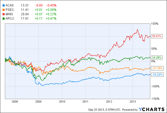 And we have to keep in mind that looking back at what we see today is a really bad way to look at the industry. Allied Capital, a private-equity BDC, essentially went bankrupt during the financial crisis. Ares Capital bought it out. Likewise, Patriot Capital suffered significant losses only to be bought out by Prospect Capital. American Capital faced technical default on its covenants during the financial crisis, and it survived only because it liquidated investments at the bottom of the market!