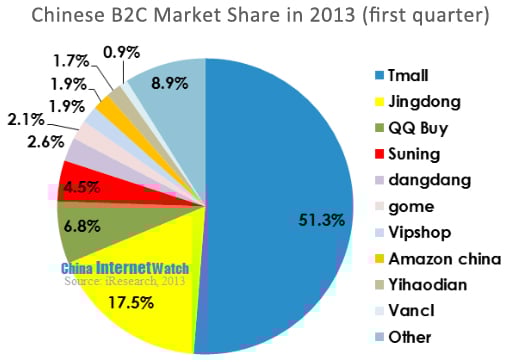 Compared with Alibaba's T-mall, Dangdang is quite small. According to iResearch, in the first quarter of 2013, Dangdang had only a 2.6% share of the online consumer shopping market. Although this number is above Amazon China's share by 0.7 percentage points, it represents a small proportion of T-mall's huge share.