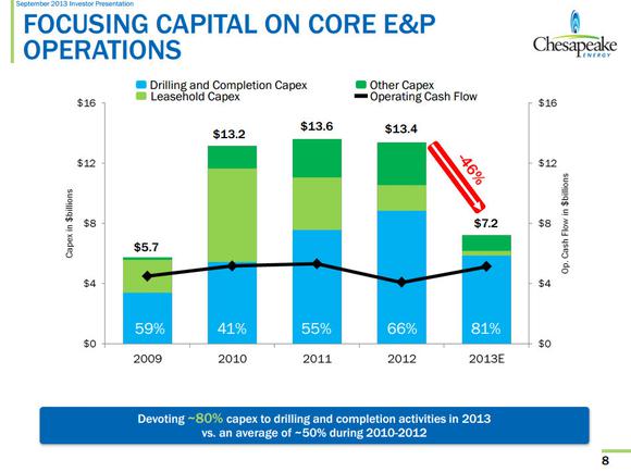 While a few hundred million dollars extra per year is a rounding error for a company that's spending $7 billion on capital expenditures in 2013, it's still a lot of money. It could have been used to pay down debt, buy back depressed stock, or even fund additional wells. It just doesn't make sense to me that Chesapeake is paying a dividend when it can't generate enough cash to prudently grow its business.