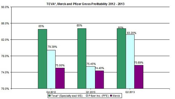 In terms of profit margins, the little rise in net sales didn't change the company's gross profitability for specialty medicines (excluding MS treatment sales). Teva's gross profitability remained higher than other leading pharmaceutical companies' profitability as indicated in the chart below.