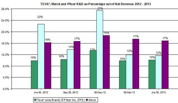 Pfizer's R&D as a percentage of revenues reached 12% in the second quarter of 2013; Merck's ratio is the highest of these three companies at 17%. If Teva continues to allocate smaller portions of its revenues toward R&D, the company's potential growth in the future might slow down.