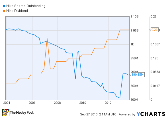 As shares outstanding decline and dividends increase, they form a lovely "X" on the graph that hits the sweet spot, rewarding investors with increasing value per share over time. In the past, Nike's success has surged using elite athletes such as Michael Jordan and Tiger Woods, but its iconic Nike "swoosh" brand image will serve the company well for decades to come.