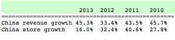 With revenue growth in China far in excess of the other segments, aggressive expansion is warranted. Coach is a highly visible and recognizable brand name, and they are in the early stages of cracking the Chinese market, so they need to move while they are at the top.