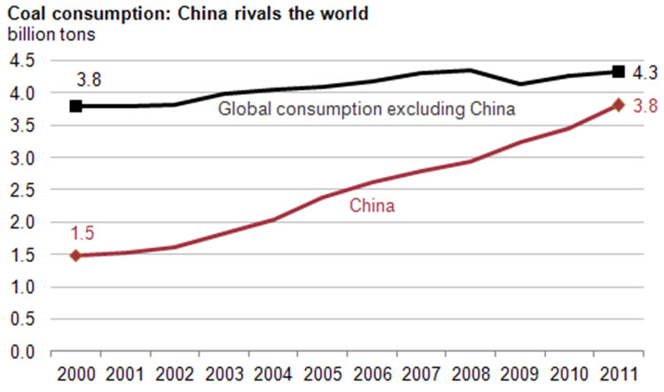 Coal's share of the global energy mix continues to rise. By 2017, coal will come close to surpassing oil as the world's top energy source according to the International Energy Agency. In fact, the world will burn around 1.2 billion more tonnes of coal per year by 2017 compared to today, equivalent to the current coal consumption of Russia and the U.S. combined. China and India will lead the growth in coal consumption over the next five years.
