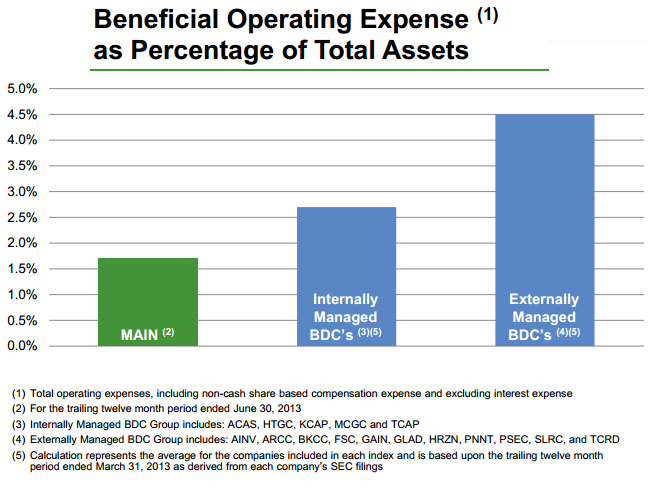 The company makes this point very clear in its presentations to shareholders. Here's a chart of Main Street Capital's total costs as a percentage of assets compared to other BDCs: