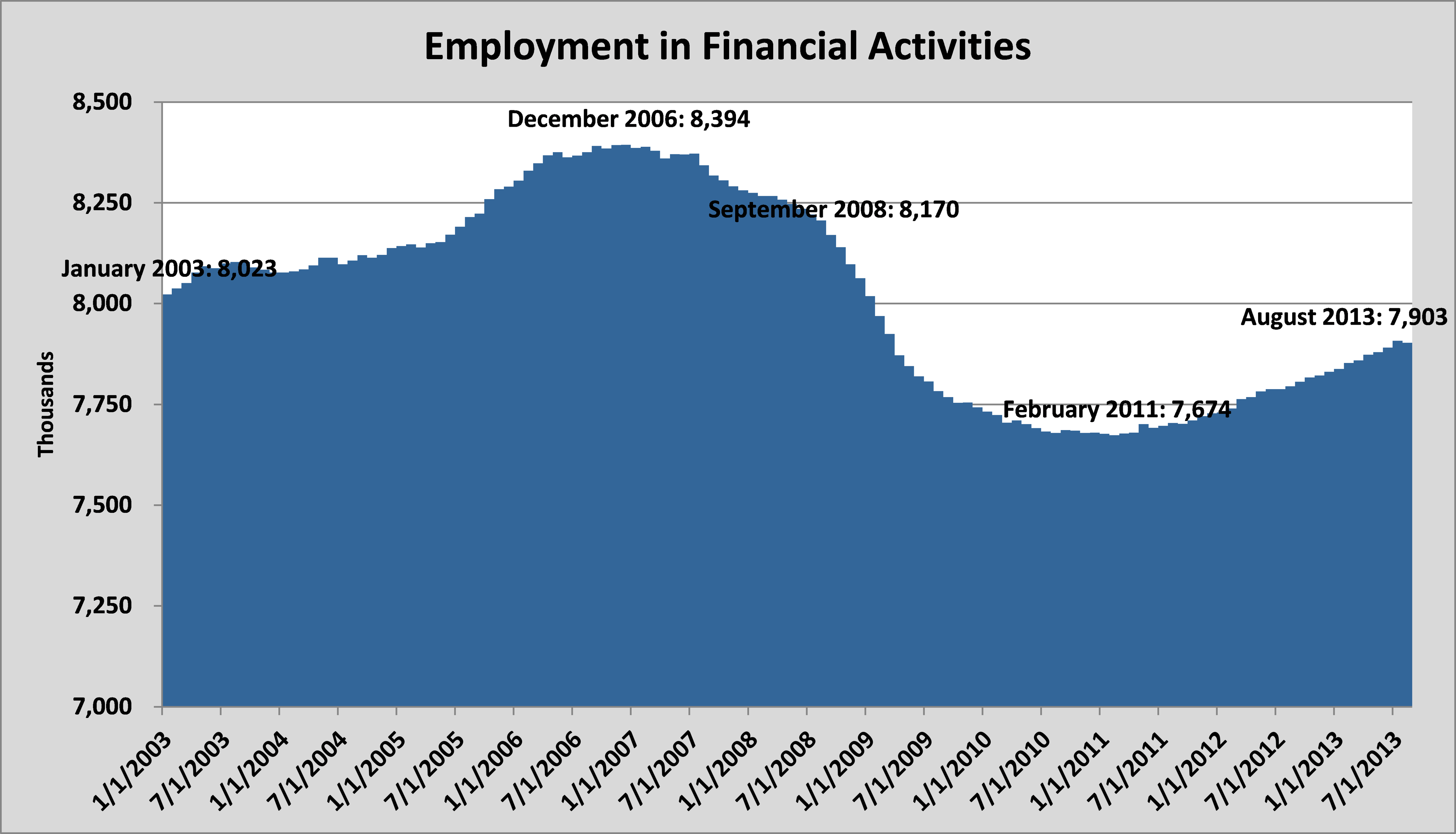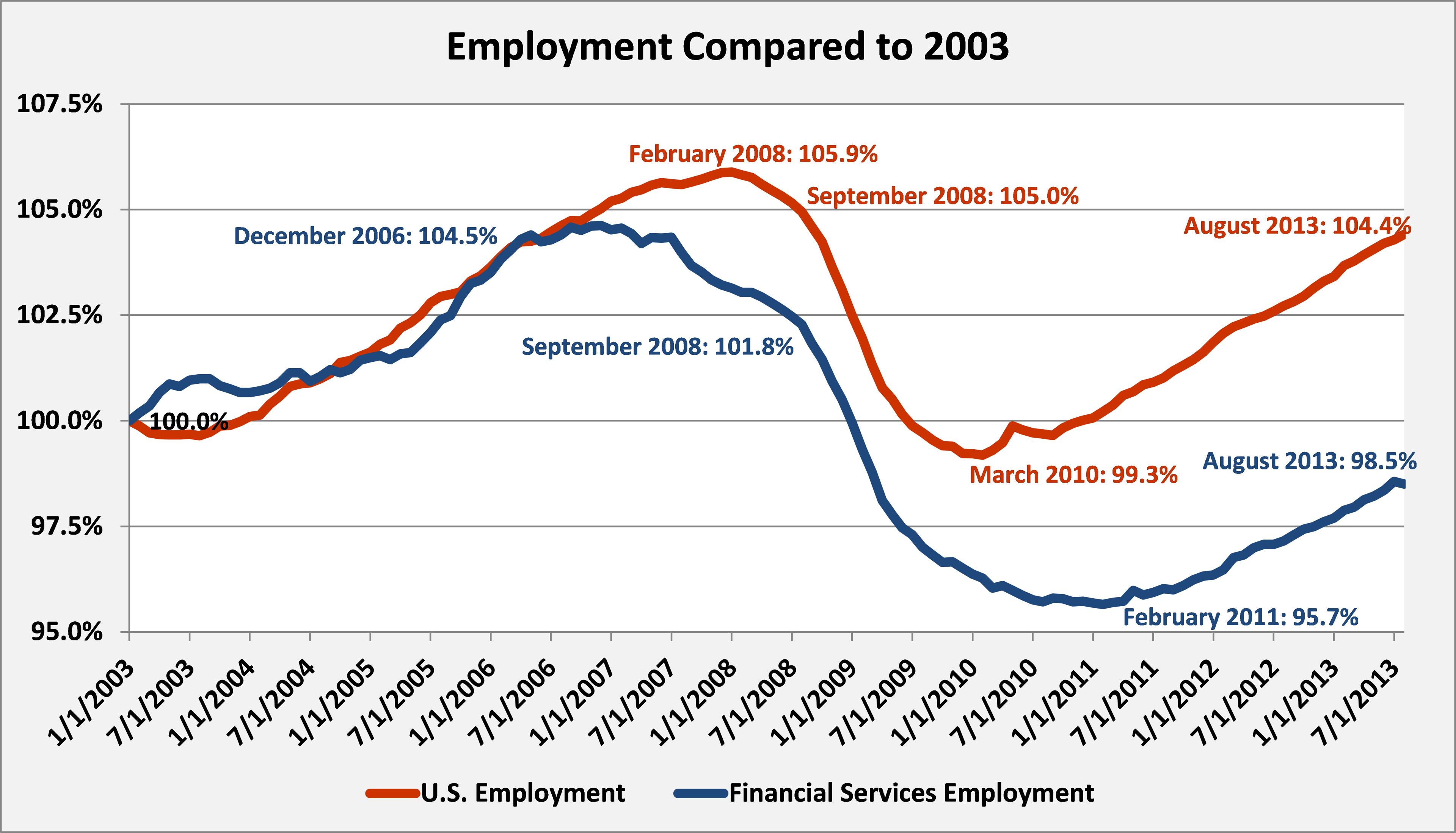 While the financial sector has recovered from the employment lows seen in 2011, it still remains below the employment in 2003. This is radically different from the picture of the U.S. economy: