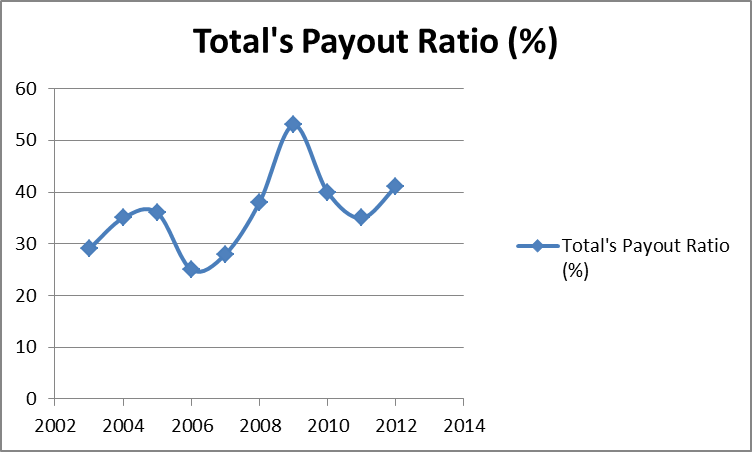 Total pays a very nice annual yield of around 4.6%, but more surprising than the yield itself is the relatively small portion of the company's profits it represents. The company has consistently kept its payout ratio under 40% throughout the past decade, with the only exception being in 2009, when earnings were pretty poor across the entire market.