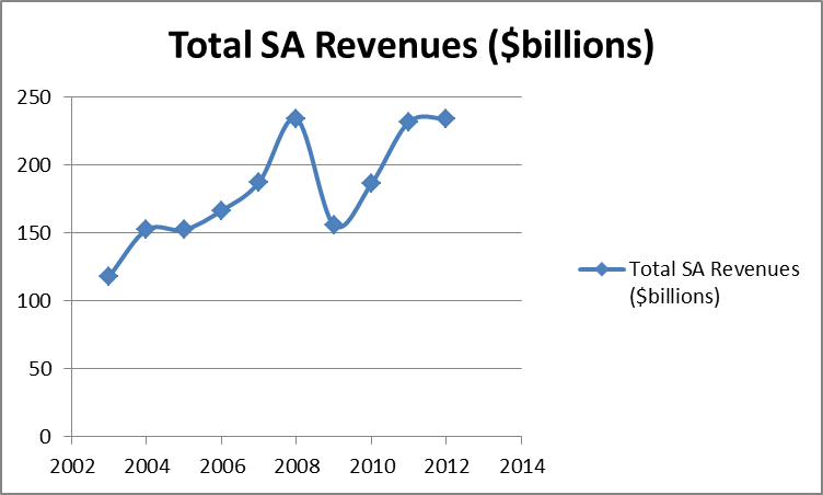 The vast majority (80%) of Total's income comes from its exploration and production business (E&P), while the rest is split between refining/marketing and chemical manufacturing. Over the past decade, the company has done an excellent job of growing its revenues, and actually produced its best year ever last year, just topping revenues from the peak "oil bubble" year of 2008.