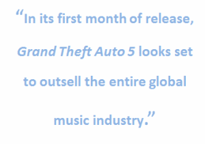 The game's publisher, Take Two, was quick to note that Grand Theft Auto 5's mere three days needed to reach $1 billion in sales makes it the fastest selling property across all forms of entertainment. To put the games sales into context across other forms of entertainment, the global music industry sees less than $1.4 billion in record and song sales each month. In its first month of release, Grand Theft Auto 5 looks set to outsell the entire global music industry.