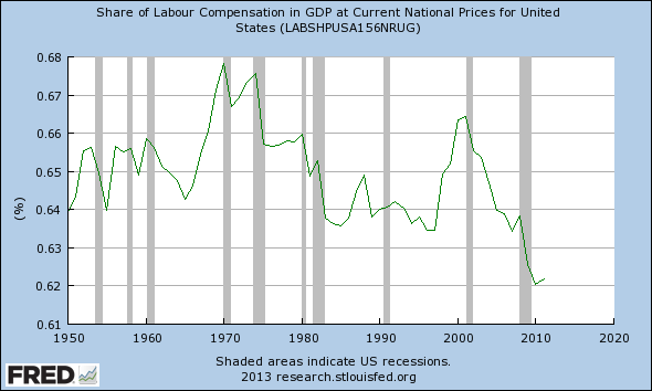 - Labor's share of GDP has fallen from more than 66% in 2001 to a little more than 62% in 2011.