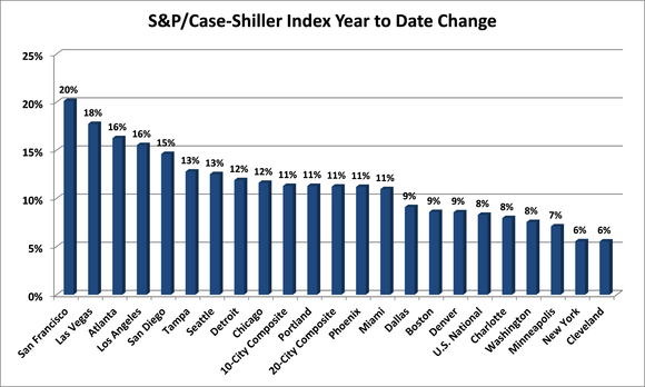 In fact, earlier this week, the S&P/Case Shiller real estate index, which measures the home prices in 20 of the largest U.S. cities baselined to 2000, was announced through July -- and five cities have seen their prices skyrocket in 2013: