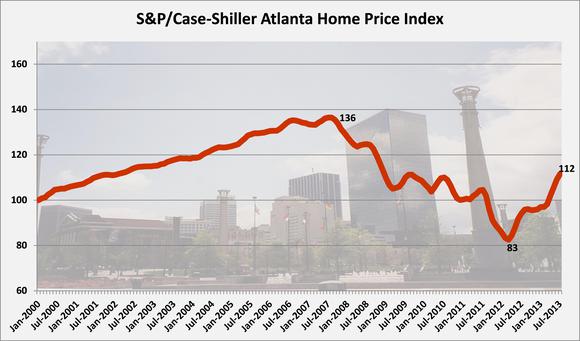 Surprisingly though, Atlanta has watched its prices come back incredibly strong, up 35% since March of 2012, which is only bested by San Francisco's 40% rise. Southern banking stalwart SunTrust (STI +0.00%) could be the biggest benefactor here, as almost 33% of its loans are mortgages or home equity lines.