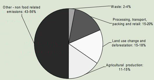In 2012, the CGIAR Research Program on Climate Change, Agriculture and Food Security released a report stating greenhouse gas emissions (GHG) from the global food system accounted for about 28% of all GHG emissions. Of that chunk, deforestation and direct emissions from farms made up the largest percentage.