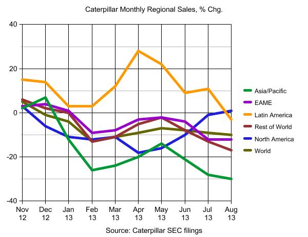 After Caterpillar's last earnings report, I said I saw hope for recovery. While there is obviously a lot of negativity shown in the chart, I also saw beacons of light. I expected Latin America to turn negative eventually because it was heading in that direction, and North America to turn positive because it was on a steadily rising trajectory. Both of those scenarios have since played out, but a few regions, in particular the Asia-Pacific, have gotten worse.
