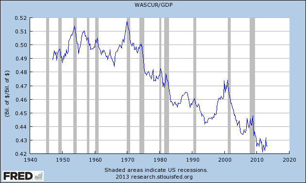 One, worker wages as a percentage of GDP have plunged. It looks like this: