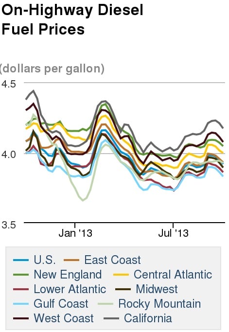 For the same period, average retail diesel prices fell $0.03, for a national average of $3.919 per gallon. On a regional basis, West Coast prices made the deepest $0.036 dip, while Rocky Mountain prices dropped just $0.016 per gallon.