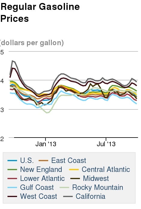 Retail regular gasoline prices clocked in at a national average of $3.425 per gallon for September 30, $0.07 below last week's price tag. Midwest prices dropped the most ($0.108), while the Rocky Mountain region saw only a $0.037 dip in gas prices.