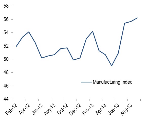 After August's index reading grew 0.3 points to 55.7%, this month's index clocked in at a slightly higher 56.2%. That's the highest reading since April 2011 and the fourth straight increase in the monthly index. Based on surveys of purchasing managers, a reading above 50% indicates that the manufacturing economy is generally expanding, while below 50% indicates that it is generally contracting.