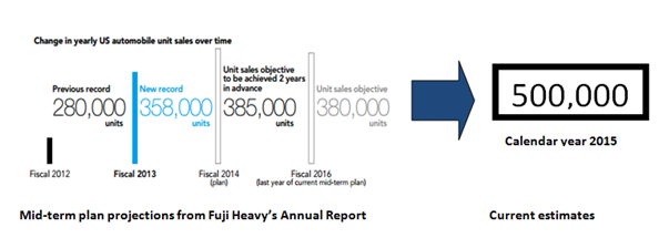 In 2011, Subaru had rolled out its midterm plan called "Motion V," which targeted 850,000 vehicle sales by the 2016 fiscal year. Out of these, 380,000 were to come from the U.S. What management did not anticipate was that its cars would become so popular in the U.S. that 358,000 cars would be sold in 2013 alone. This led management to revise its U.S. sales expectation to be about 385,000 in the 2014 fiscal year.