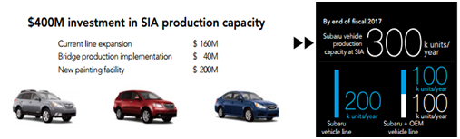 It will invest $400 million and increase capacity by 100,000 units at this plant. The plan calls for hiring 900 new employees, the expansion of an existing line, and equipment upgrades. The remaining 30,000 units will come from Japanese facilities through efficiency enhancements. This will increase Subaru's overall production capacity to 902,000 vehicles and SIA's to 300,000 . The 100,000 Toyota Camrys that are produced by SIA under a contract with Toyota, which owns 16.5% of Fuji Heavy , is not included in these numbers.