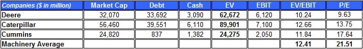 After examining Deere's operations, let's examine its valuation compared to the industry and other heavy machinery companies.