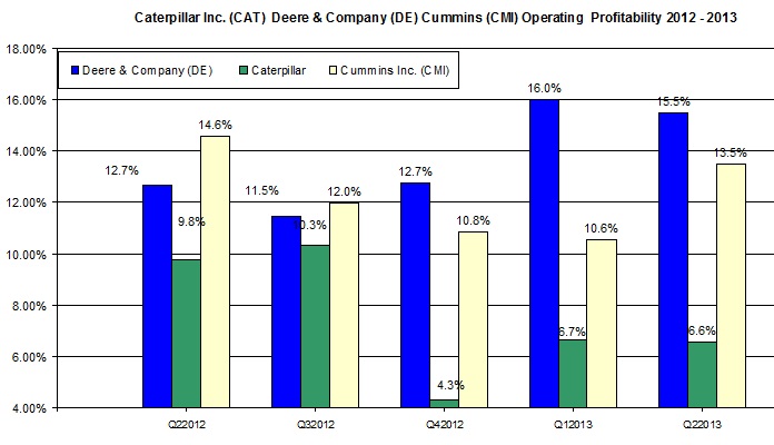 As seen in the chart, Deere is leading the way in this category. Cummins' profit margin is lower than Deere's at nearly 13.5%. Caterpillar's profit margin was the lowest at 6.6% in the second quarter of 2013.