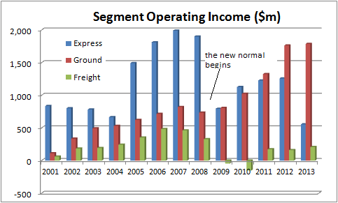 Our economy has changed since the financial crisis, and demand for FedEx's services has changed with it. Companies are now a lot more willing to use lower-cost delivery options, even if they ultimately receive their deliveries a day or two later. In response, FedEx's lower-cost ground segment is now its key earnings generator, while the contribution from its pricier express service has fallen.