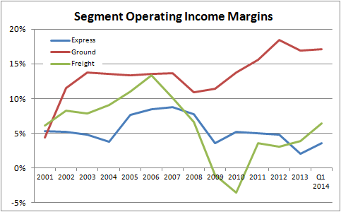 FedEx should see margin expansion in the next few years as productivity improvements, and the shift in its earnings toward the ground segment, kick in. Indeed, analysts give FedEx a forward P/E ratio of 13.4 for May 2015 -- a discount to UPS's projected 16.7 for December 2014.