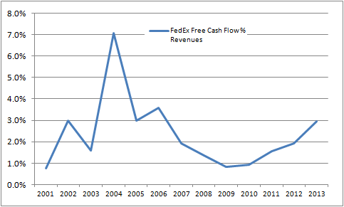 FedEx's aim must be to increase the amount of free cash it converts from its revenues, because compared to the 9%-plus that UPS has delivered in the last two years, FedEx's conversion looks small. Ultimately, free cash flow is what counts to an investor, because it fuels a company's dividends and buybacks.