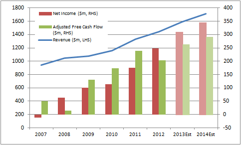 Sources: Company releases, author's estimates for 2013 and 2014.