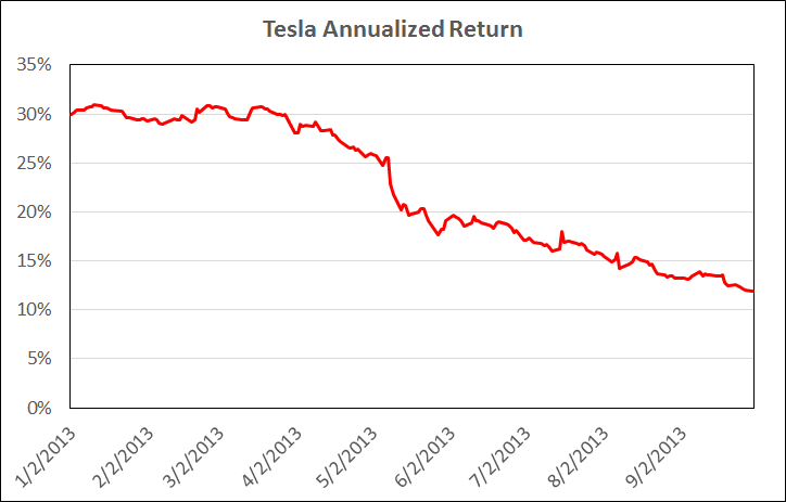 At the beginning of the year, with Tesla shares in the $30s, an investor could have achieved an annualized return of 30% in this extremely optimistic scenario. But now, that expected return has dropped to about 12%. In other words, absolutely everything has to go right for the next decade for Tesla investors buying today to achieve slightly better-than-average returns.