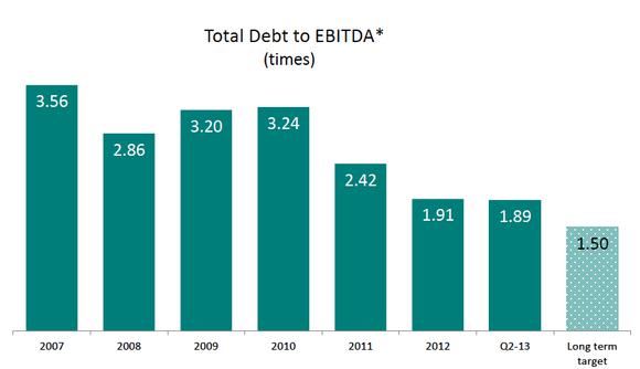 This goal is designed to improve flexibility and increase leverage. The reduction of debt will give management increased leverage, thus allowing the company to capitalize on opportunities as they appear. As you can see by the chart below management has been successful in reducing this ratio. Based on future projections, management expects to reach this goal in 2014.